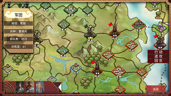 点击兵部的组建军团,选派一名大将带兵。注意,大将的能力值很重要,武力和智力都会影响到军队的战斗力,智力高的大将还会使用计谋。同时记得野心不宜过高,忠诚度越高越好噢。