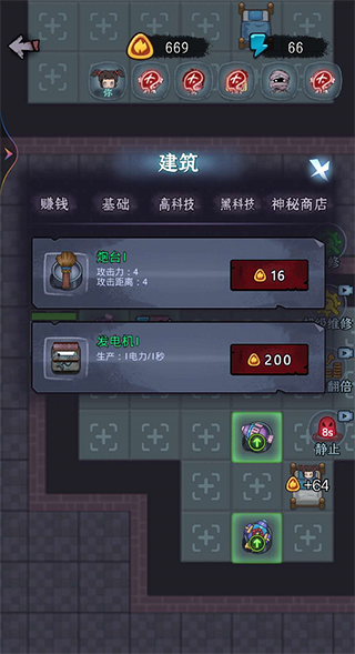 并发展经济建造炮台,抵御敌人。游戏中玩家只可以在房间中的空地板上进行建造,玩家点击空地板后,出现建筑菜单。