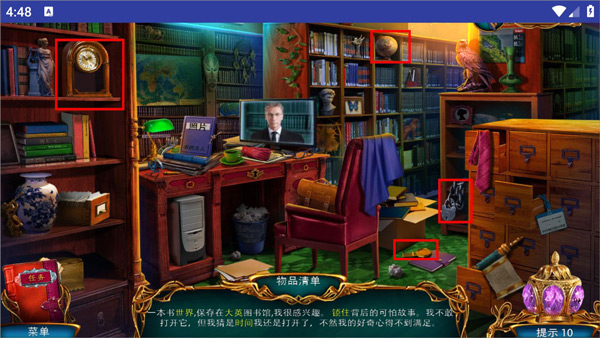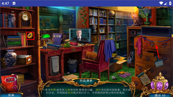 7、还可以收集后面书架上面的地球仪,还有右边柜子下弥漫的锁链,还有左边下面的钟摆放上左边架子上的钟。