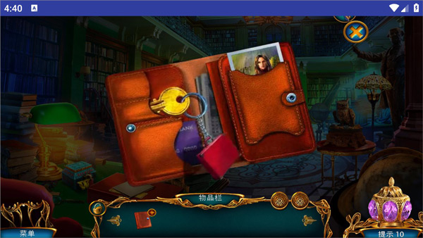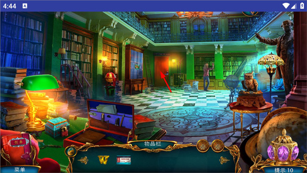 11、点击漂浮在中间的书,推出点击旁边的猫头鹰收集拼图嵌块,点击左手边红色布盖着的地球仪,打开获得紫外线灯还有拼图嵌块。
