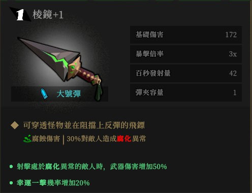 这是一把火属性的手枪,配合太子的烟雾手雷可以打出混合异常——爆炸,对于前期清理大堆怪物十分好用。同时烈焰弹丸作为单点式的手枪,攻击敌人的弱点部位时可以造成极高的伤害,非常适合神射手的你!