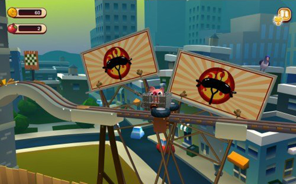 3、 当我们看到小猪乘着斗车的时候,可能会以为接下来要操控其行驶,但是事实上并非如此。可以看到场景中布置有蜿蜒曲折的轨道,远处是山峦、沙漠、城市等壮美景象,不过我们来这里可不是欣赏美景的,如何让小猪在轨道上安全行驶才是首要任务。