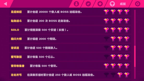 奖杯的达成要求有很多种,比如 Miss判定 连击数 总分数 完美打击 开启Fever状态次数等等。