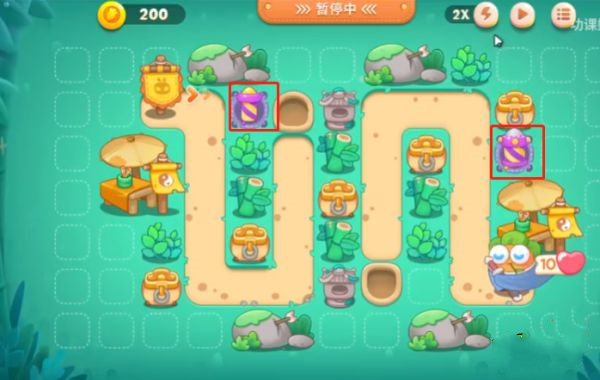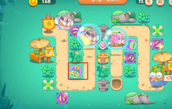 4、第四波大萝卜放在正下方放火炮的地方,这个位置是本次关卡里面重要的地方,机关被冻住的时候可以快速进行清理,左侧障碍也靠这个火炮清理。