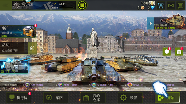 4、点击开始,进入游戏备战室,这里有坦克库(选择你要上场的所拥有的坦克),兵工厂(可以升级装甲、炮管、引擎等),涂装(坦克花纹,可以增加攻击力和开火速度)以及贴花(标志,可以增加攻击力和速度),其中涂装和花纹用钻石买,而且有时间使用限制,大概两天就消失。