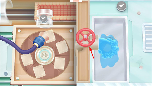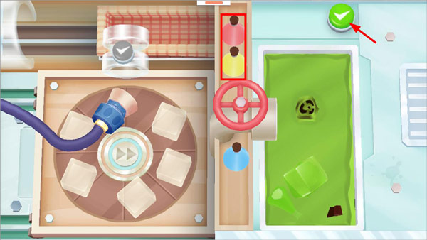 3、拖动机器吸住果冻,放到右边/左边的池子里,点击红色门阀开水浸泡果冻;