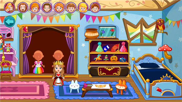 城堡中共有12个房间,内置许多角色及大量服装、玩具、配饰及小道具,同时,每个房间还都可以高度互动,比如点击即亮的台灯、床头装饰魔法特效、会张嘴巴的玩具鱼等等,让玩家可以在里面尽情的玩耍。同时,游戏中为小公主和她的家人们穿的服装款式多样,数量众多,玩家可以自由的开启换装游戏体验。