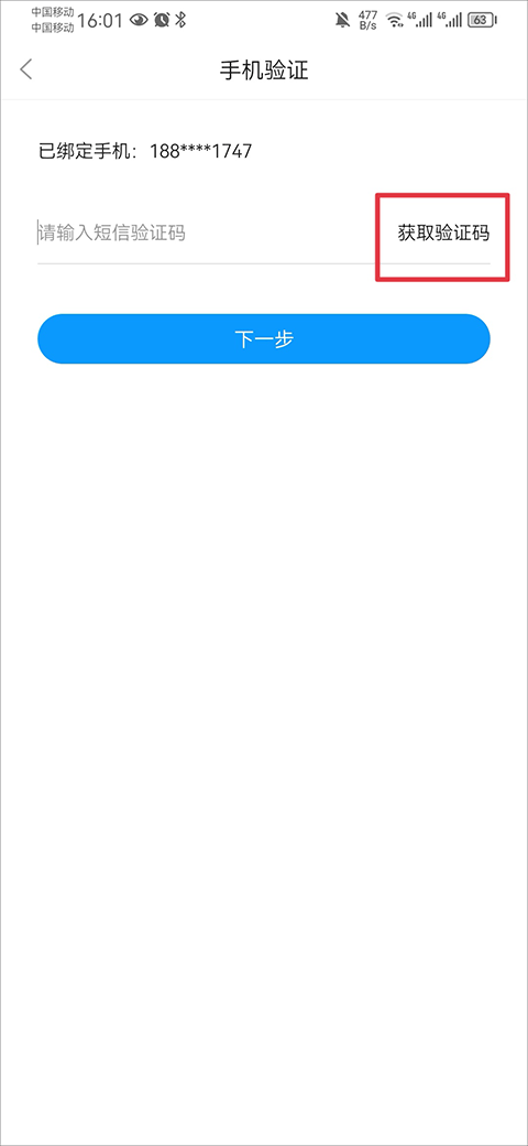 4、在手机验证界面中点击获取验证码,然后将验证码输入后点击下一步