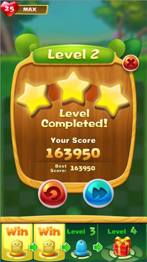 1、游戏玩法和其他三消游戏差不多,三个同样颜色的小鸟即可消除,而4-5个及以上则可组合成不同的消除道具;