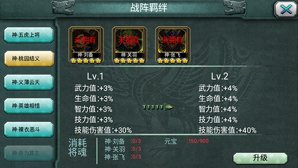 2、三人羁绊:三人羁绊的效果通常比二人羁绊更为显著,如“桃园结义”(刘备+关羽+张飞),这个羁绊不仅提升了武将的属性,还象征着他们之间深厚的情谊和战斗中的默契配合。