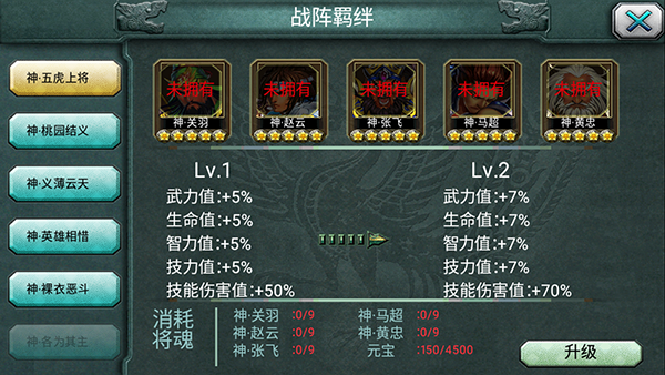 3、四人羁绊与五人羁绊:四人羁绊和五人羁绊的效果更为强大,如“江东血统”(孙权+孙坚+孙尚香+孙策)和“五虎上将”(关羽+张飞+赵云+马超+黄忠)。这些羁绊不仅提供了高额的属性加成,还可能附带特殊的技能效果,如“五虎上将”羁绊能够大幅提升队伍的战斗力,并在战斗中发挥重要作用。