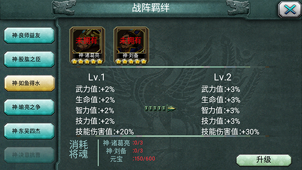 1、二人羁绊:游戏中存在多个二人羁绊组合,如“如鱼得水”(刘备+诸葛亮)等,这些羁绊能够为队伍提供一定的属性加成。