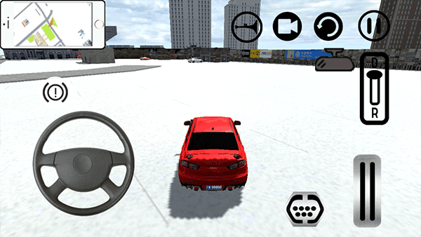 2、来到【自由驾驶】模式,右上角一排按钮分别是喇叭、视角、重来、暂停/菜单、第二排是后视镜、档位,最下面则是方向盘、刹车和油门。