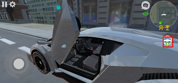 2、我们移动左下角的摇杆来到车旁,车门上会出现一个蓝色的把手按钮,点击它就能打开车门;