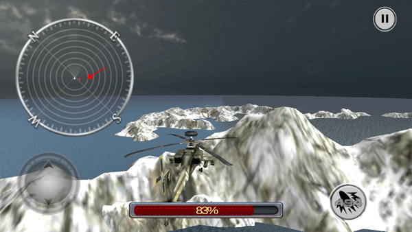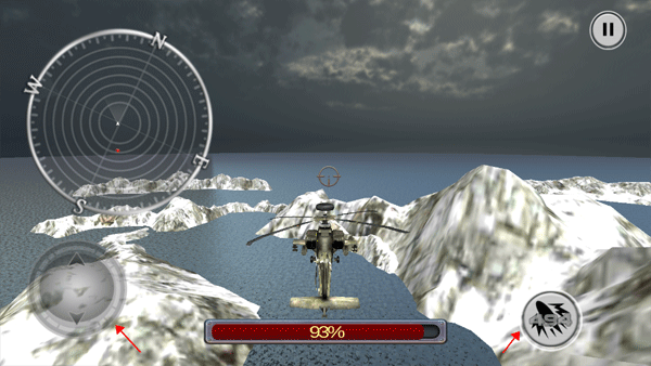 4、游戏的开始是玩家需要驾驶一个直升机,左边的是方向键,控制方向用的,右边是导弹,用来抵御外敌用的。
