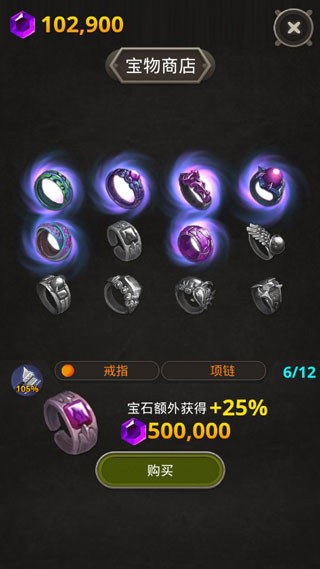 宝物作为游戏的一大核心,需要大量的钻石才能解锁,但毋庸置疑所提供的加成属性也异常的可观,戒指主要以增加收益获得,项链增加攻击力,且都可以叠加。