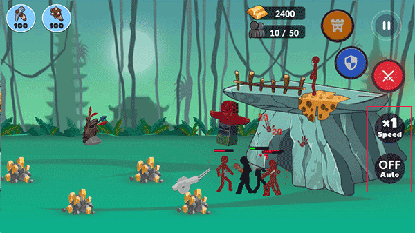 4、点击屏幕右侧的红色按键可以攻击,点击speedx2可以开启倍数,off auto开启自动让火柴人工作。