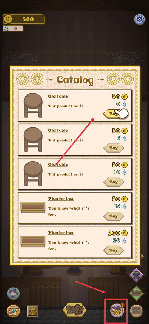 1、在游戏中首先点击右下角商店图标购买桌子和花盆