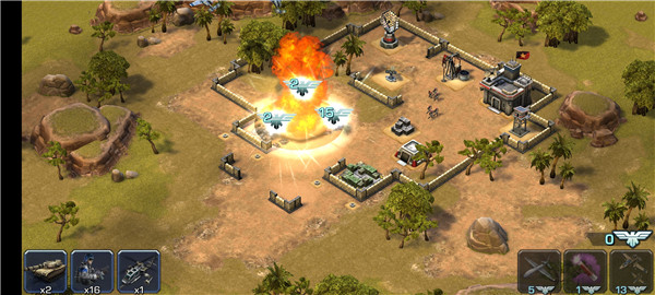 2、辅助战机的合理使用,游戏中敌方攻击防御要优先击杀,但是由于地图太大,有可能部队会分散,这时候可以使用烟雾弹发射到指定的地方,部队会都激活攻击该区域。