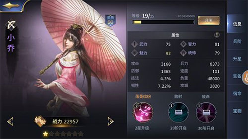 她跟姐姐大乔一样,因为长得太美而天下闻名。据说小乔曾暗恋过周瑜,但目前仍是单身。所以小乔和周瑜一起还能激活“佳人才子”的宿命,基础兵力+1000。