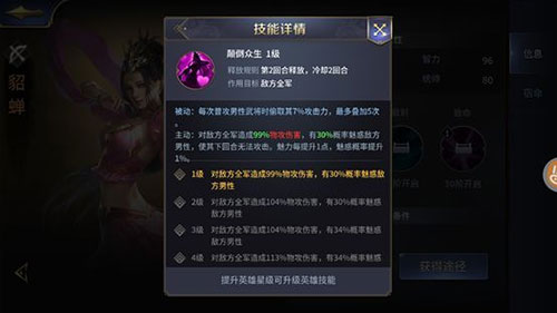 “颠倒众生”这个技能非貂蝉莫属了,第2回合释放,对敌方全军造成物攻伤害,还有一定几率魅惑敌方男性,使其下回合无法攻击。魅惑概率和魅力值有关。同时普攻男性武将时还会偷取他们的攻击力叠加到自身。不愧是倾国倾城的貂蝉,群体伤害的同时还能魅惑男性。