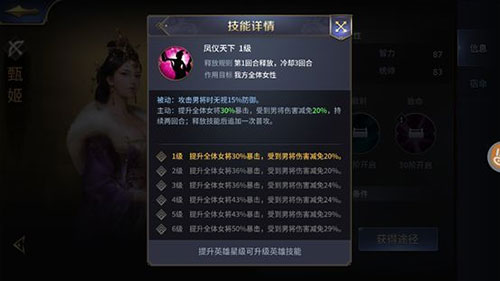 因为她是当太后的命,所以“凤仪天下”是甄姬的专属技能。可以提升全体女将的暴击,同时减免受到男将的部分伤害,可以持续两回合,释放技能后追加一次普攻。攻击男将时还能无视部分防御。简言之,甄姬就是女队核心,减伤增暴。