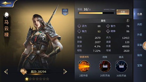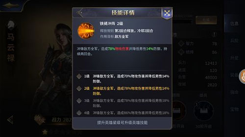 马云禄的技能是“铁骑冲阵”,第2回合释放作用于敌方全军,造成大幅物攻伤害并降低男性的防御,可持续两回合。所谓男性克星,降敌防御,就是马云禄。