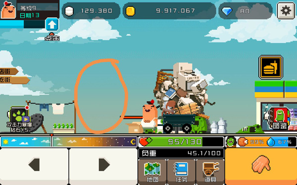 3、打碎街上的一切,收集材料,升级你的研发机器;