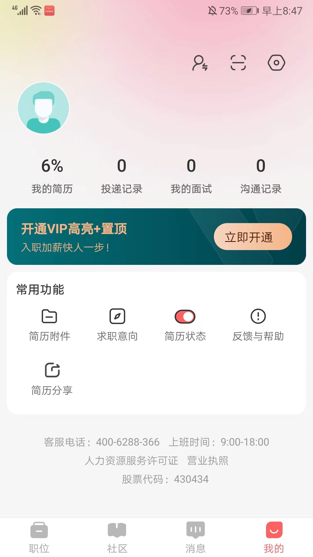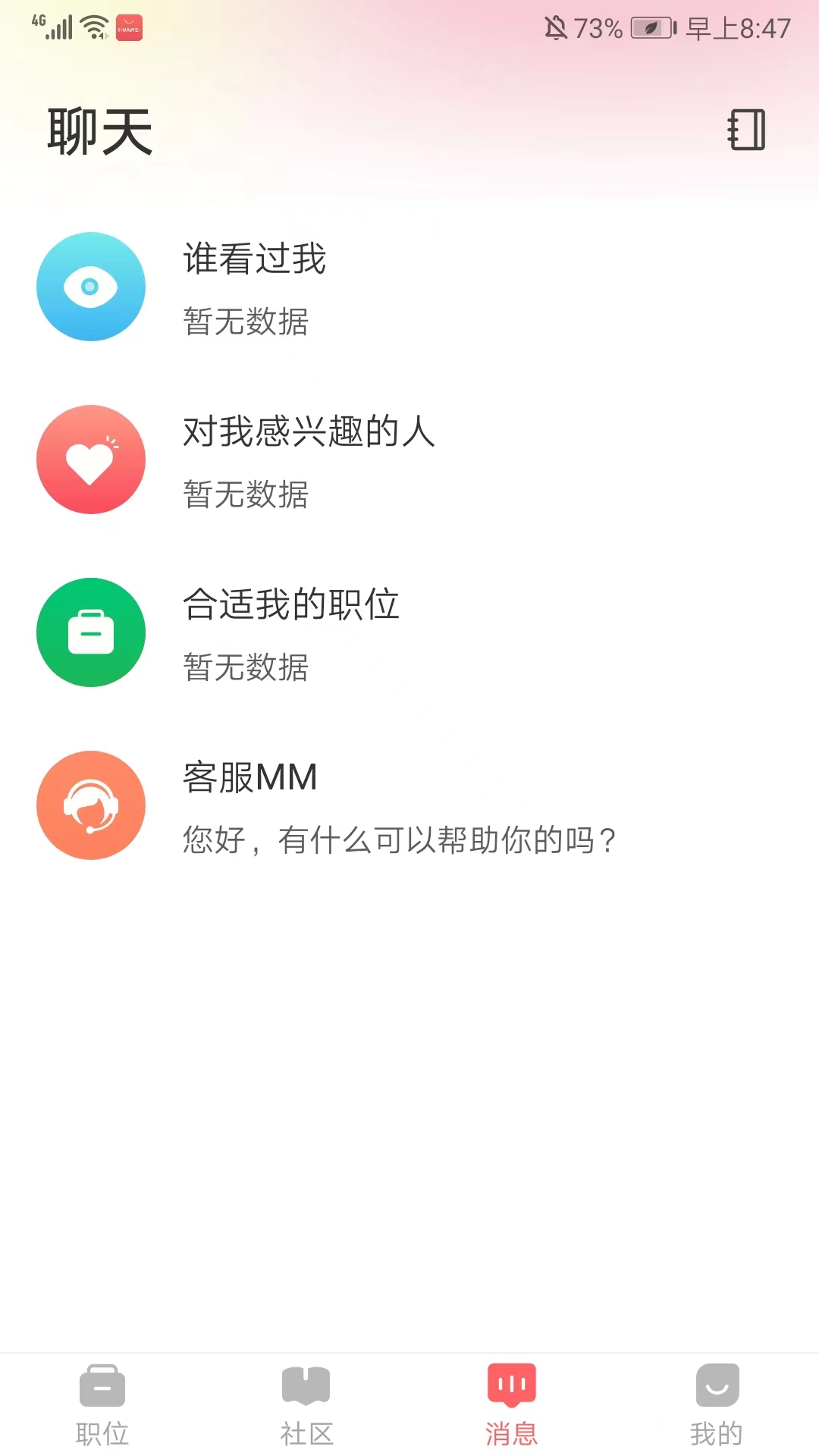 2、进入应用主界面,包括【职位】、【社区】、【消息】和【我的】栏目,