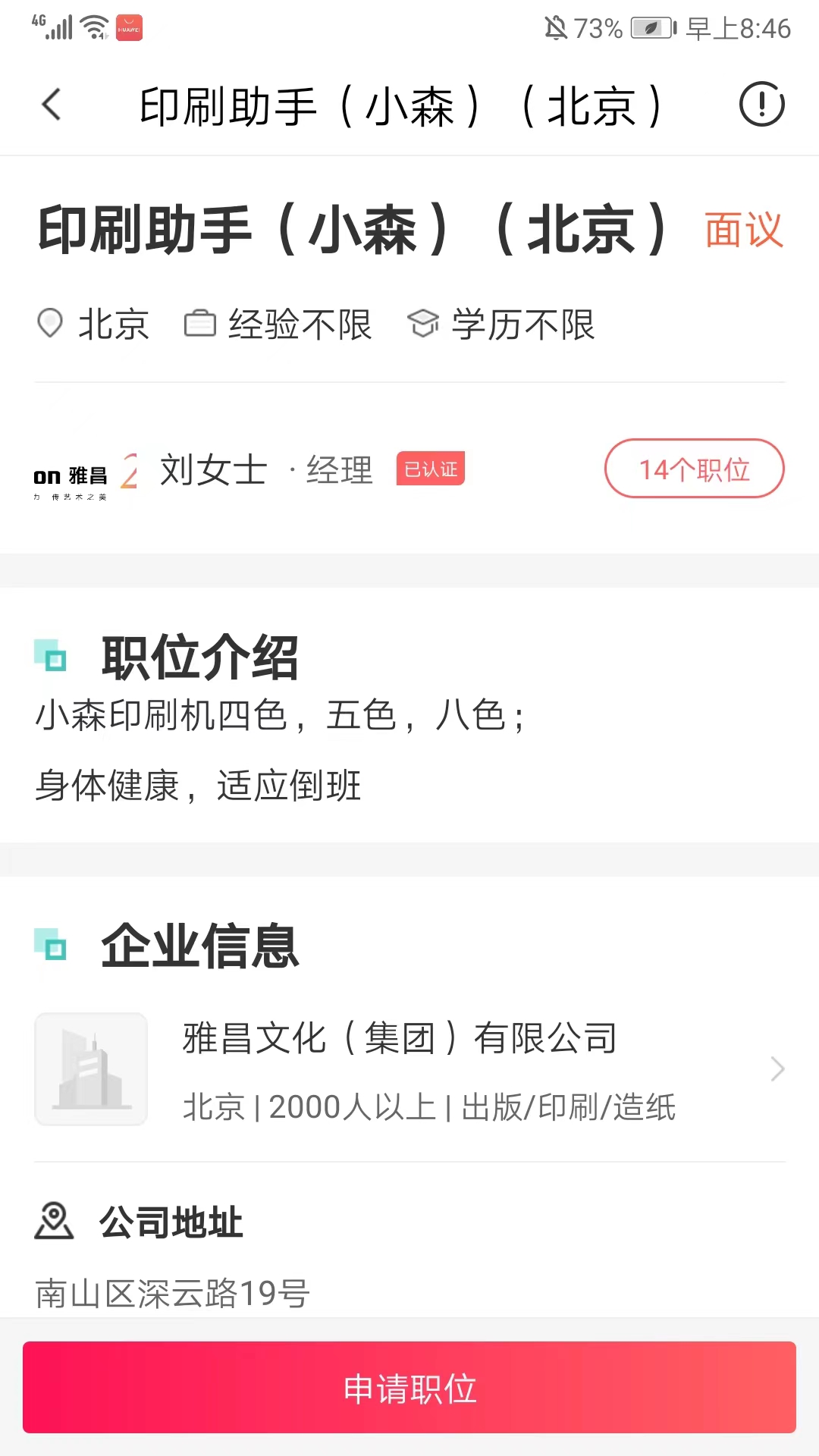 4、进入职位详情后,可看到当前职位的介绍、企业信息、公司地址等信息,感兴趣的话可以点击下方【申请职位】选项,