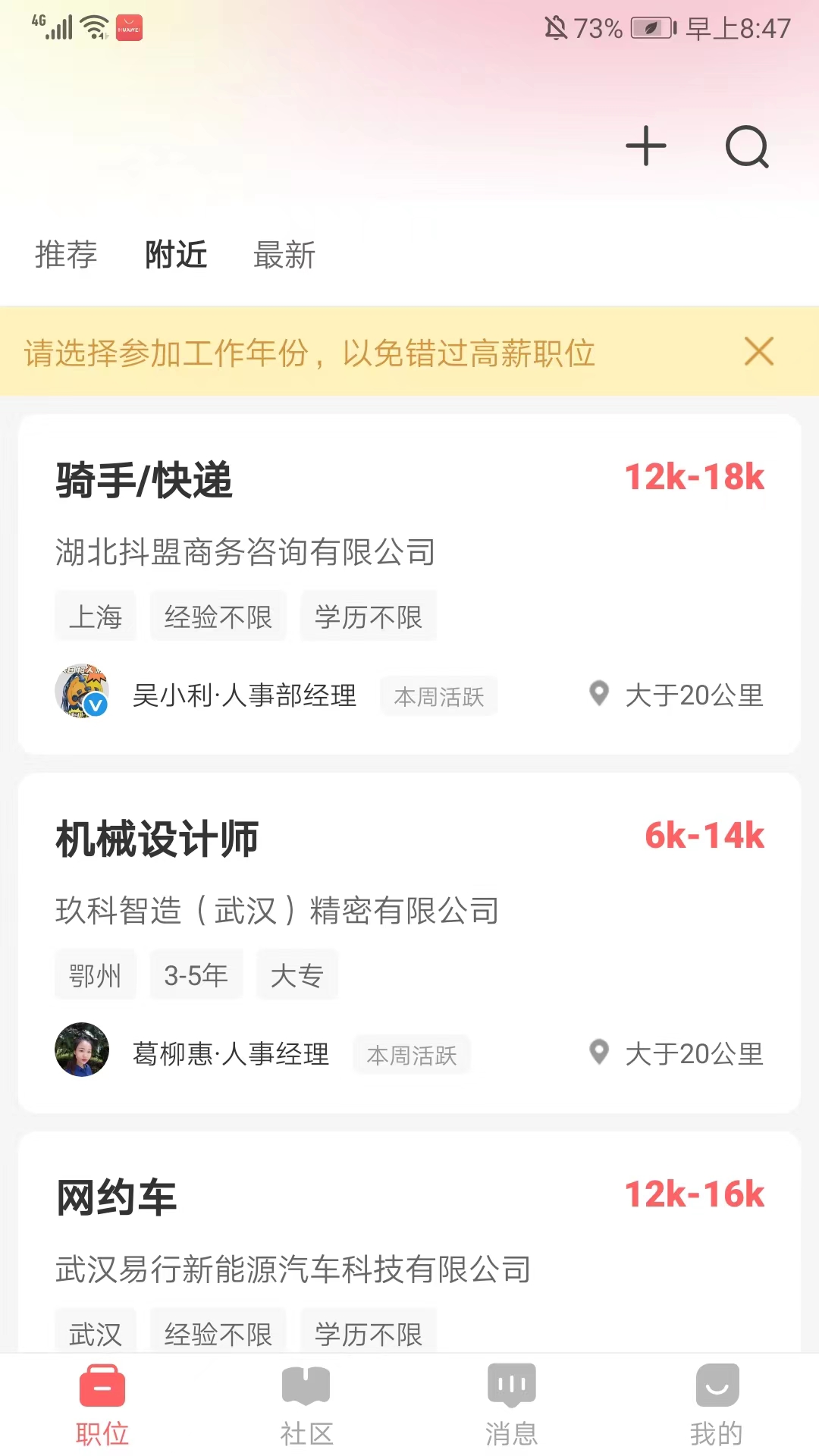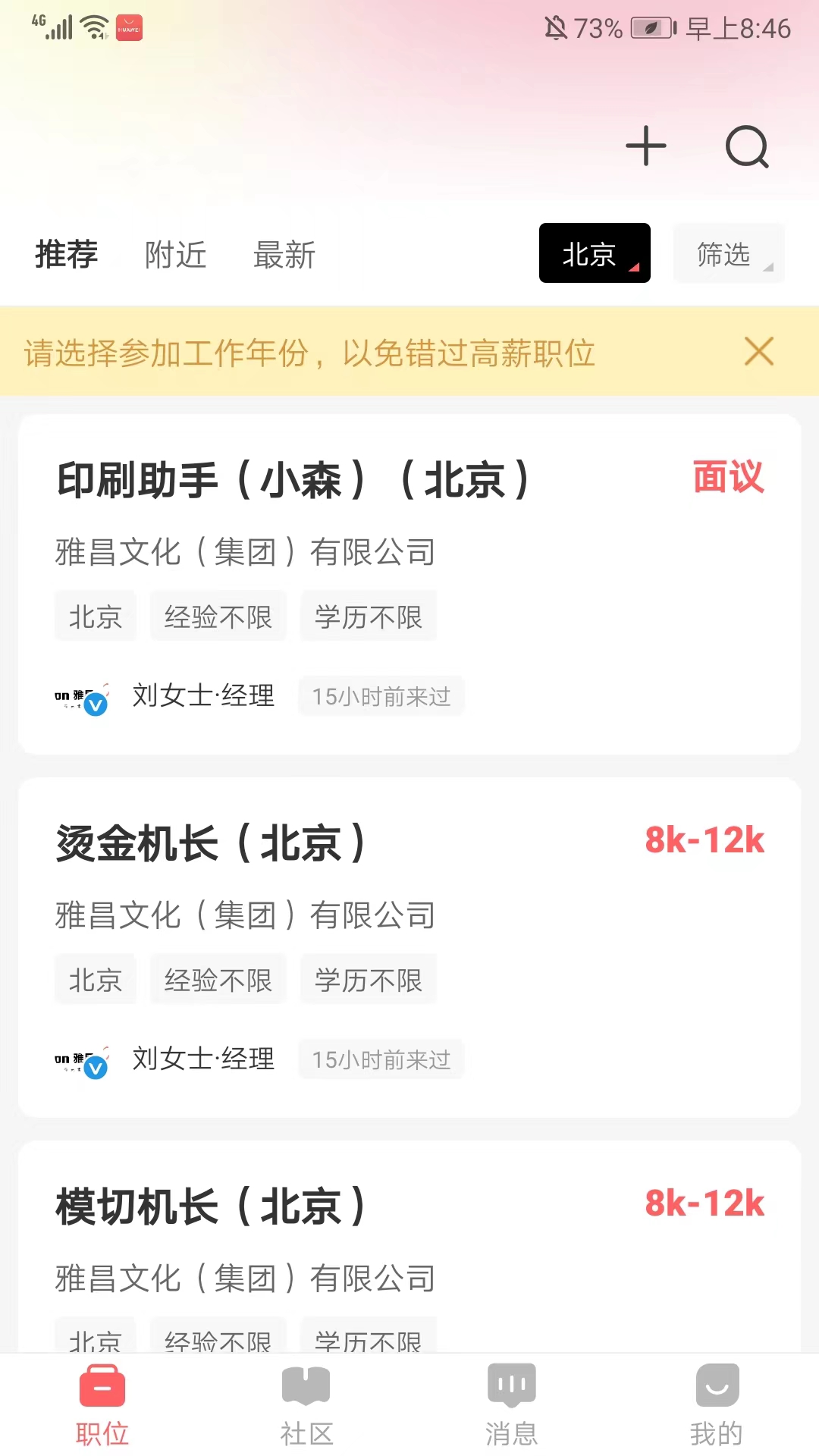 7、进入【社区】界面,可以浏览当前最近的招聘信息,