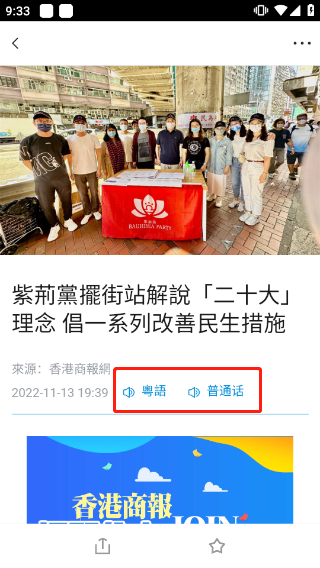 2、新的版本中,新增有阅读模式,用户可选择粤语或普通话自动阅读当前浏览页面的文字内容