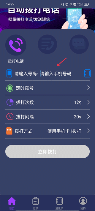 1、打开app进入首页,在第一个输入框中输入你要拨打的手机号码。