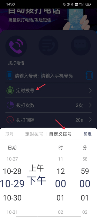 2、输好之后,就要开始设置拨号的时间,有两个定时模式,一种是自定义,一种是定时,自定义模式甚至可以设置到未来某个时间。