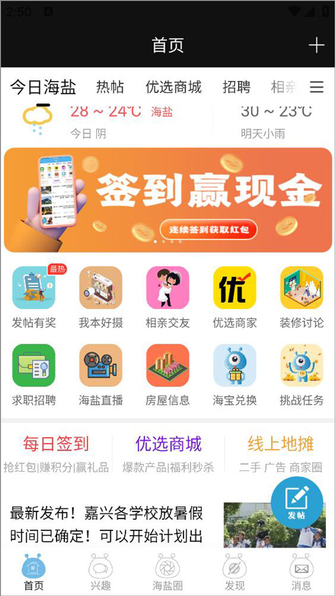1、用户打开海盐网app,登录进入首页,用户可在首页查看今日天气、热帖、优选商城、最新发布等;