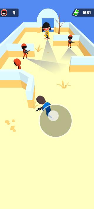 这款生存挑战游戏挺有意思的,操作简单但考验反应力。用虚拟摇杆就能射击和移动,关卡设计得也不复杂,主要是躲避守卫的侦查然后击败对手。游戏里的道具和武器升级系统让我觉得挺有策略性的,特别是能捡钱升级装备这一点,感觉很有成就感。