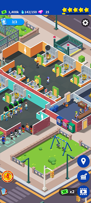 2、游戏过程中,玩家只有不断的通过升级、扩建,才能点亮游戏右上角的星星,待星星数量满足一定要求便可解锁新的地图,继续开始你的厕所连锁店模拟经营。在这里每个卫生间都是相互独立的,只要逐一完成最高等级的升级,便可陆续扩建。