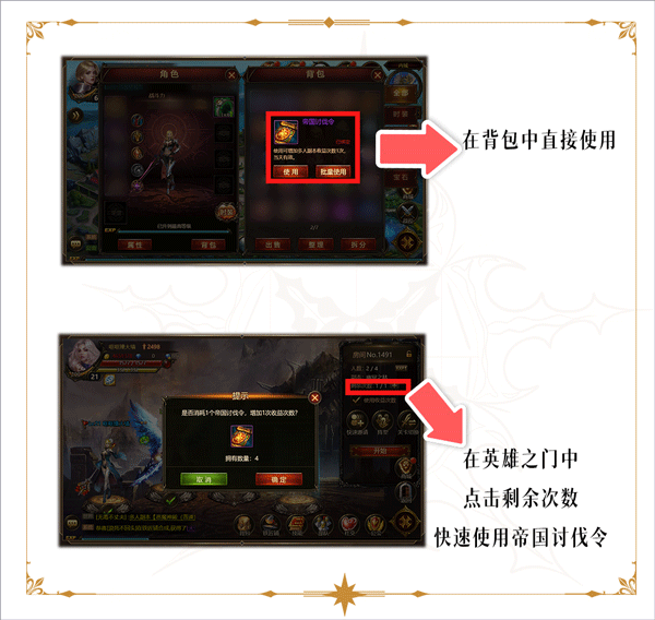 A:打开背包-找到帝国讨伐令-单击点击使用即可;在英雄之门中,点击剩余次数可快速使用帝国讨伐令。
