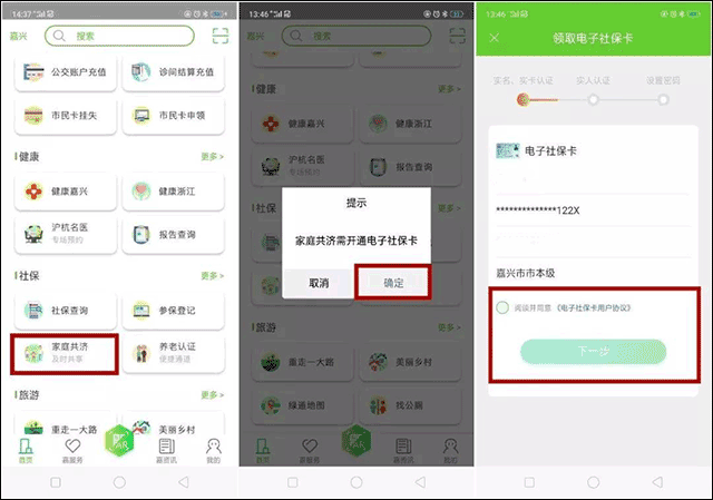 2、在“首页”中“社保模块”下点击“家庭共济”图标,然后根据提示点击确定“开通电子社保卡”,根据步骤操作,即可领取属于您自己的电子社保卡了。