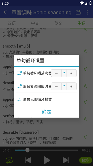 4、点击进入新闻详情页就直接开始播放英语朗读,长按左下角可以设定单句循环的次数