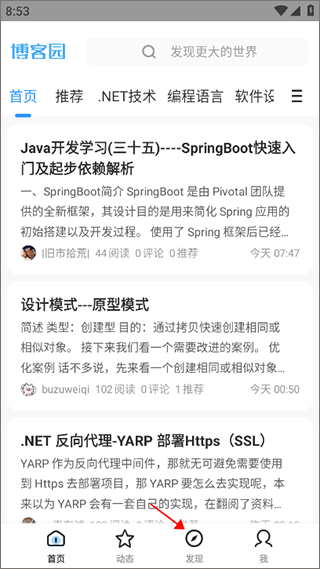 1、打开博客园手机版,点击“发现”选项