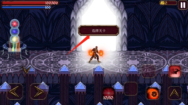 1、进入游戏点击左下控制方向的左右键,让巫师走到有光的地方,点击选择关卡。