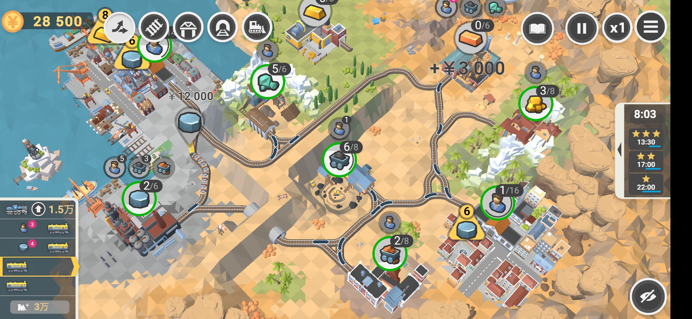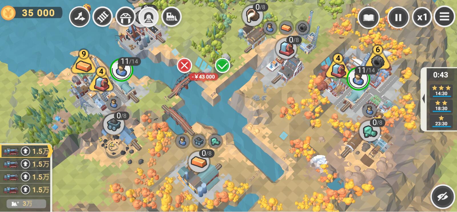 游戏中有50个关卡和多种火车类型可以选择,玩家需要合理调配资源和人口,升级火车提高效率。通关过程中会遇到各种挑战,但一旦解决就能体会到成就感。虽然有些关卡很难,比如坑道要赚够38万,但通过拆轨道也能快速赚钱,挺有意思的。