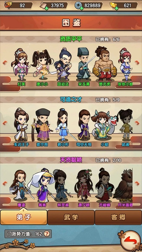 包含弟子、武学、客卿三个图鉴合集,前期主要是完成任务的方式获得弟子、武学以及客卿,当完成招募条件时,可在图鉴处招该弟子或客卿。