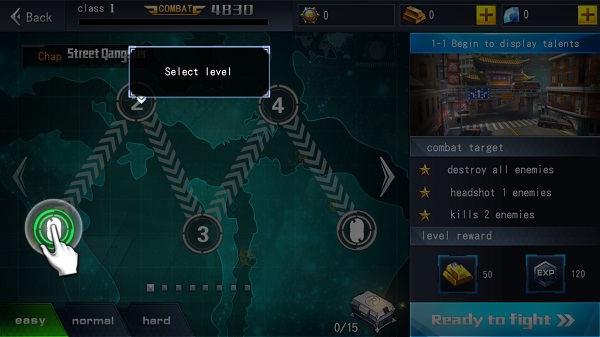 2、如图所示,闪光区域是玩家可以选择的挑战关卡,在界面最右侧显示的是通关奖励,以及获取星级的目标任务,还包括作战场景,在闪光区域的左下角“easy”、“normal”、“hard”是难度选择,依次对应的是简单、普通和困难。