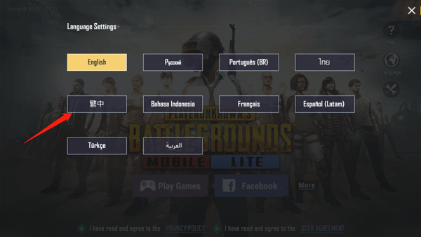 1、在本地下载安装完安卓版绝地求生低配版之后,点击进入游戏,在游戏界面点击右边的language图标。