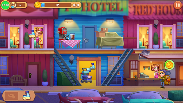 2、在游戏时,上方则会显示酒店入住客人及需要赚到完成任务的金币数量