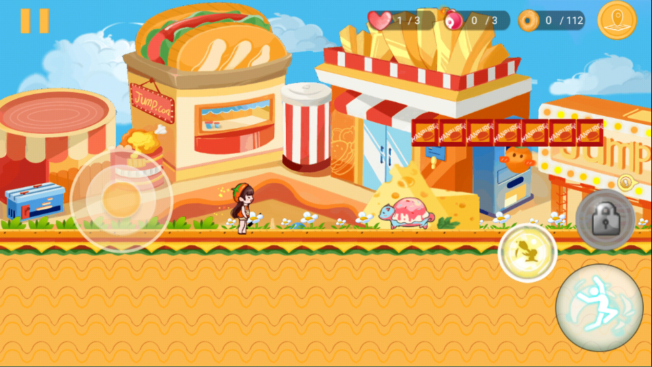 游戏操作很简单,左边控制移动,右边是跳跃和攻击。一开始可能有点手忙脚乱,不过多玩几局就熟悉了。最有趣的是每个关卡都有不同的主题场景,感觉每次通关都像是在吃美食一样。商店里还能买加速靴子,跑起来快多了,就是金币要攒够才能买。