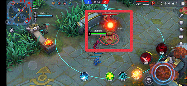 5、游戏开始时,通过左边屏幕控制英雄的移动,右边为普通攻击和专属技能,然后操控角色前往上中下路去带兵线并攻击敌方防御塔。