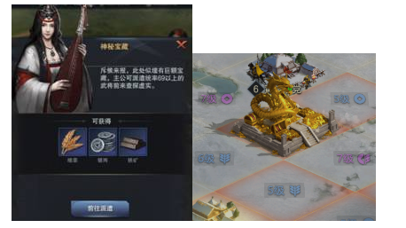宝藏会不定时随机刷新,有一定的武将属性要求才能进行采集,属于没有任何兵力支出就能获得的。奖励内容为钱粮以及铁矿资源,数量看宝藏等级而定,相应的要求也会加高。